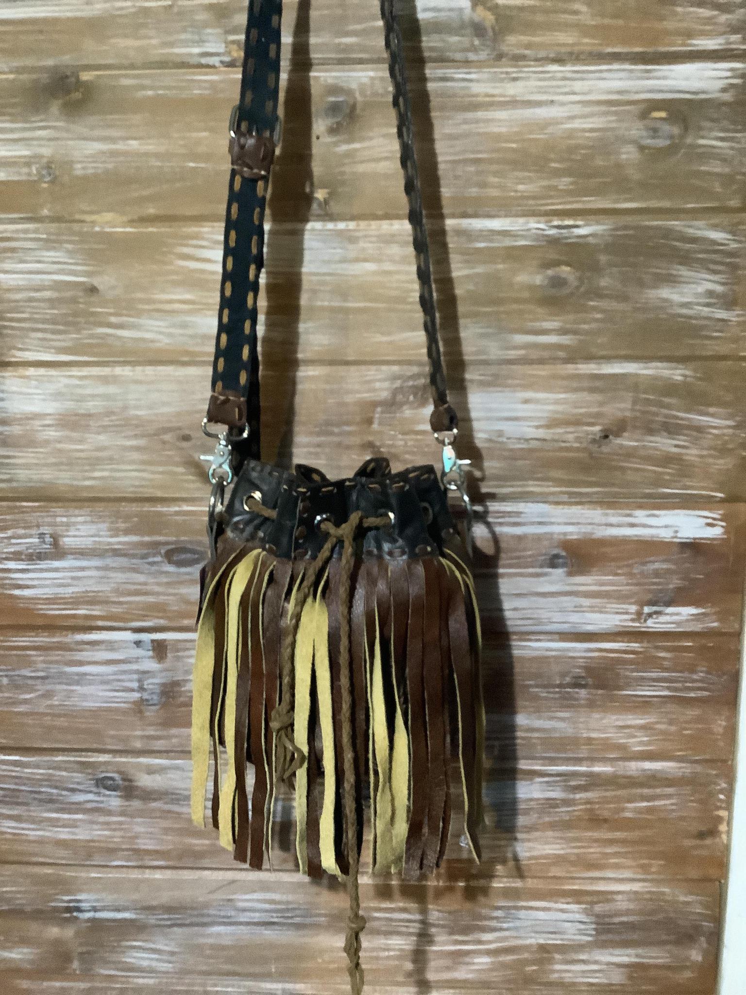 Braided Leather in eyelets create the closure for this unique design. Inside the lined pouch is a zippered area to safely keep your more personal items.