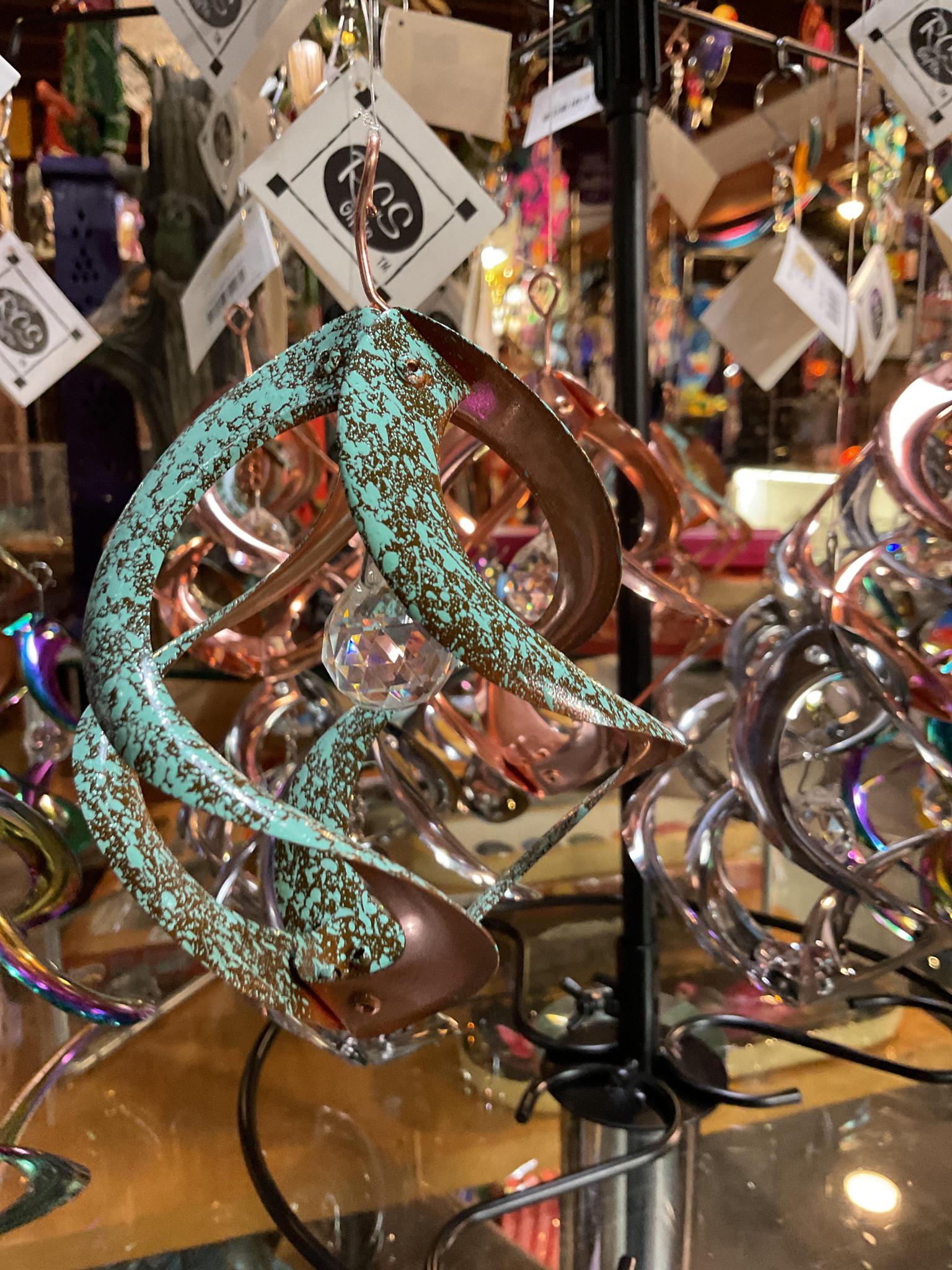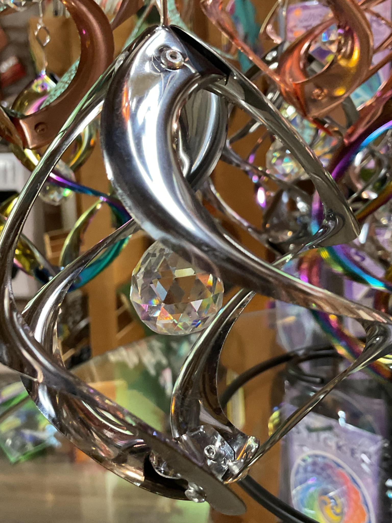 4” Spiral Sun catcher mobile, has prismatic crystal sphere which will create rainbows when flooded with sunlight in your windows or outdoor space. 14” total length hanging.