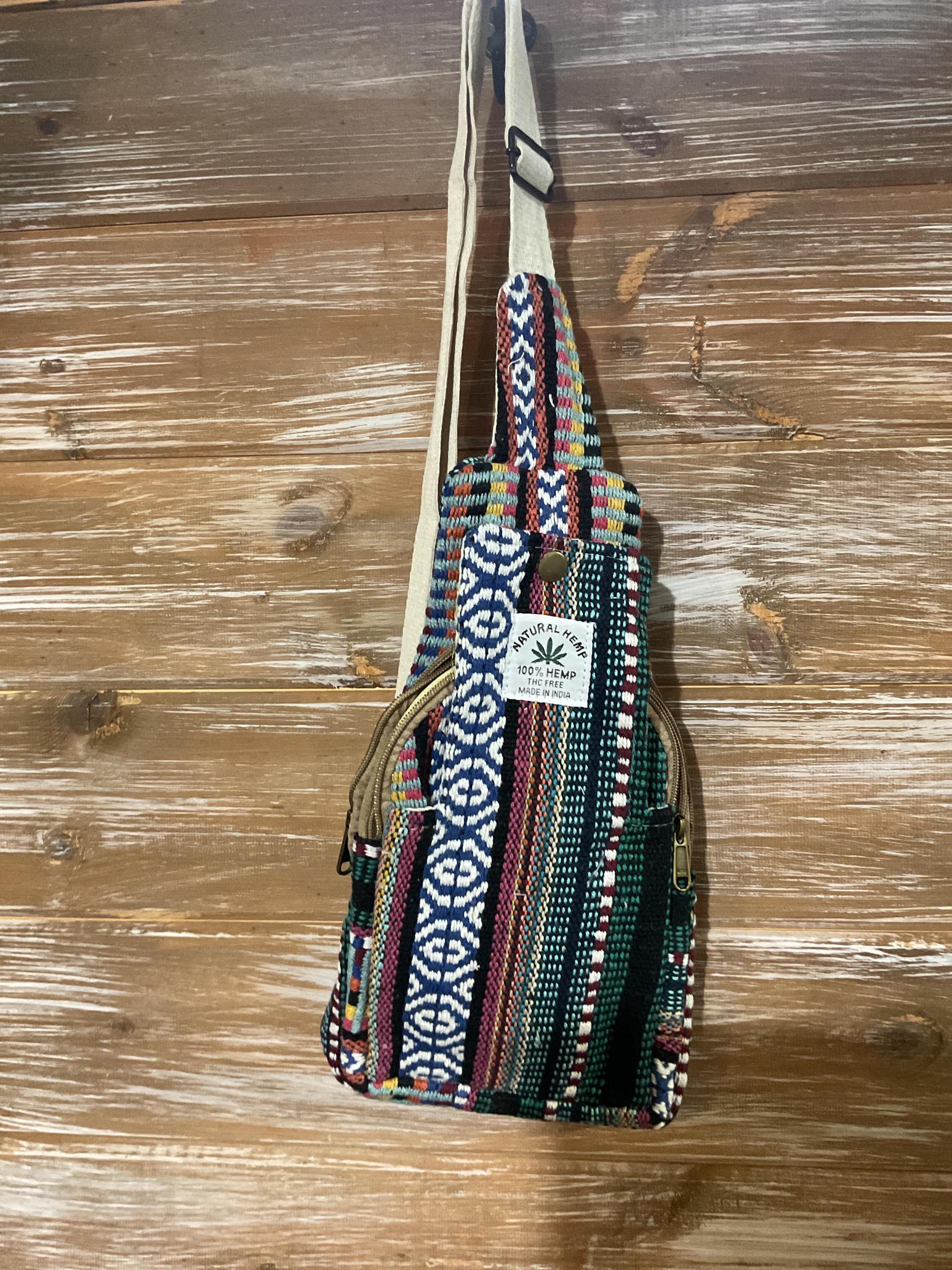 Carry your essentials in sustainable style! This durable crossbody sling is crafted from an eco-friendly hemp and cotton blend featuring a vibrant multi-color striped and geometric weave.