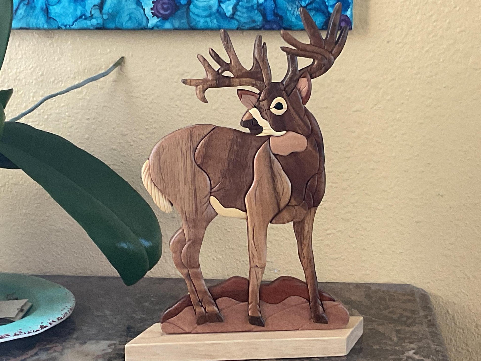Intarsia woodworking is the art of creating a mosaic-like picture from pieces of wood. Different species of wood are selected for their color and cut to size using a scroll saw. The woodworker can create an illusion of depth by carefully selecting the grain pattern and direction of each individual piece. Before gluing together the final assembly, the woodworker will sand and shape each piece. Some areas of the pattern might even be raised to create more depth.