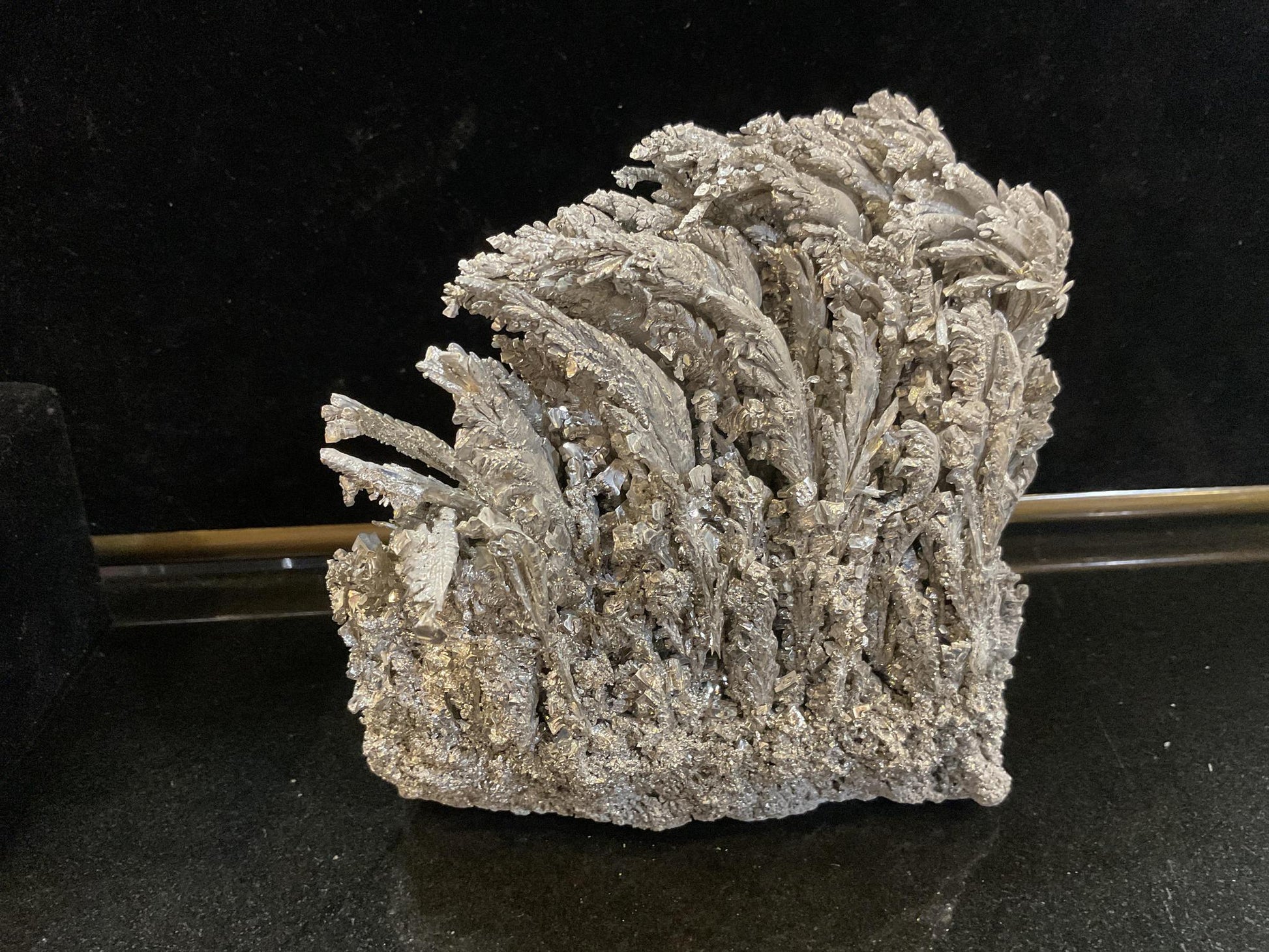 This is a beautiful and genuine Magnesium crystal cluster specimen. It's a metallic silver color with feather-like segments. It's lightweight and soft. This is sure to be a unique addition to your collection.
