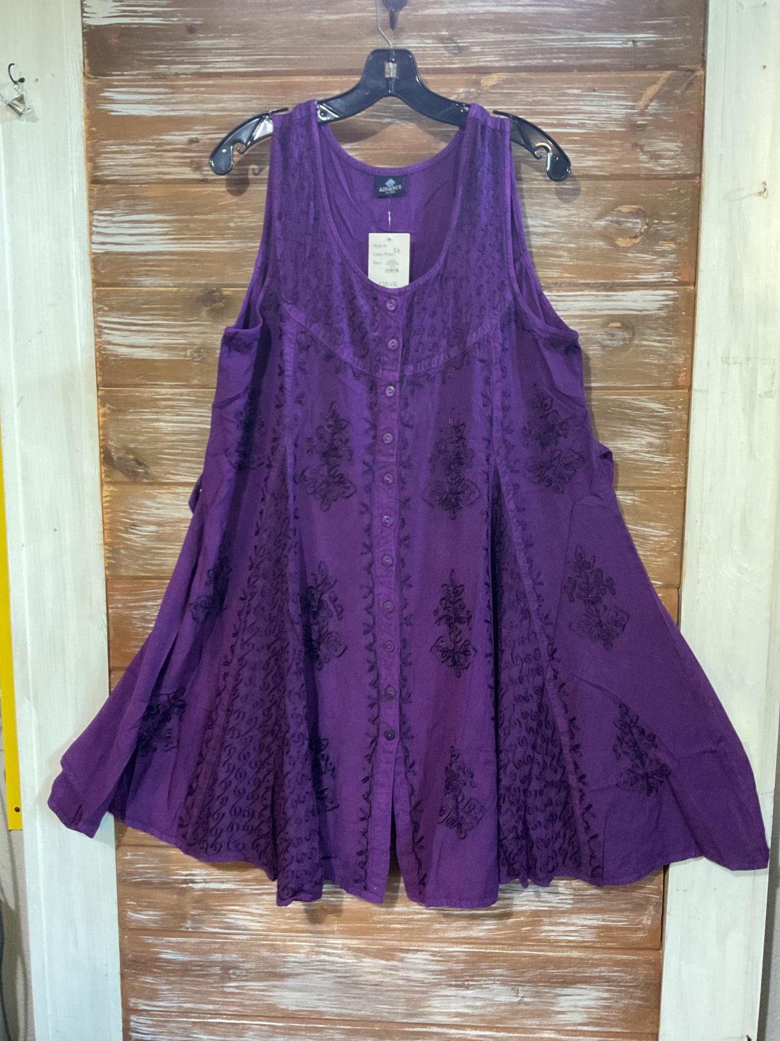 Casual short dress with embroidery and buttons down the front. Can be worn as a duster open layered over other clothing. Ties in the back.